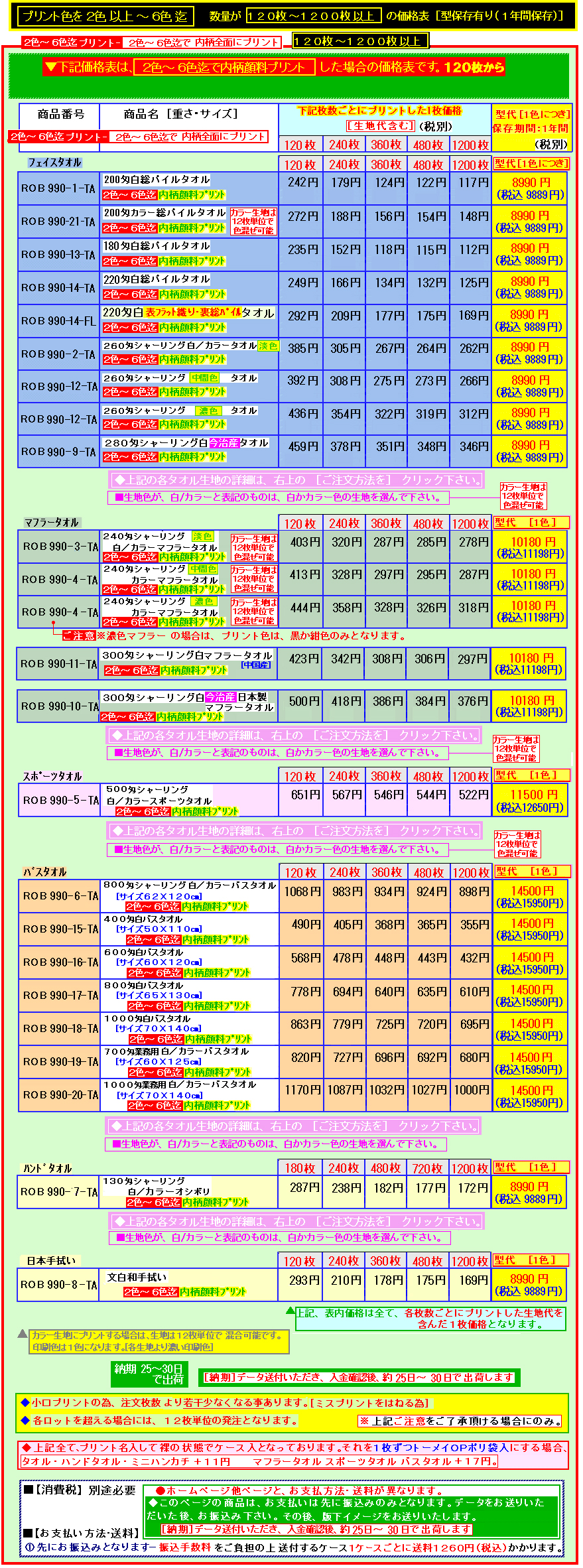 | ■[ご注文方法]小口内柄顔料プリント @本ページ下記の注文画面より、下記の商品番号・商品名・枚数・金額をご記入いただき、ご注文下さい。その時に必ず、備考欄にデザインデータ別途送付とご記入下さい。 A次に商品タイプが決まりましたら、下記デザイン作成の注意点をご覧いただき、生地サイズに併せた原寸イライトレーター10 色別アウトラインデータを info@taoru-o.com へ送付してください。 ◆各生地サイズに対し、両ヘムから5cmずつ両ミミから2cmずつ余白を残した枠内へデザイン作成下さい。 ■文字と数字のみの場合は、下記のワード用テンプレートにて、デザイン作成可能です。該当するものをダウンロードいただき、作成後、送付ください。 ◆フェイスタオル34X80pテンプレート ◆フェイスタオル34X85pテンプレート ◆マフラータオル20X110pテンプレート ◆スポーツタオル34X110pテンプレート ◆スポーツタオル40X110pテンプレート ◆バスタオル60X120pテンプレート ◆バスタオル62X120pテンプレート ◆バスタオル70X130pテンプレート ◆手拭い33X90pテンプレート |